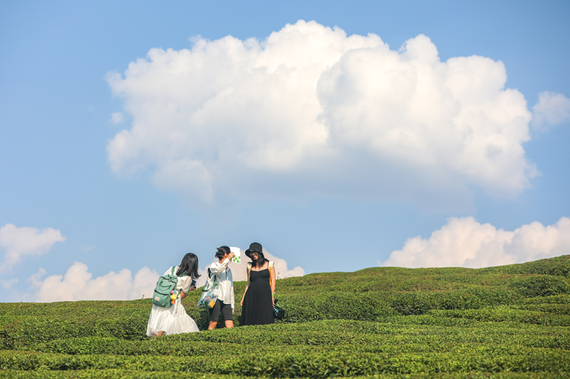 9月12日,江西景德镇浮梁县寒溪村的茶园绿意盎然,游客在茶园中游玩。当日是中秋假期最后一天,仍有不少游客来此观光游玩。(图片来源:中新社)