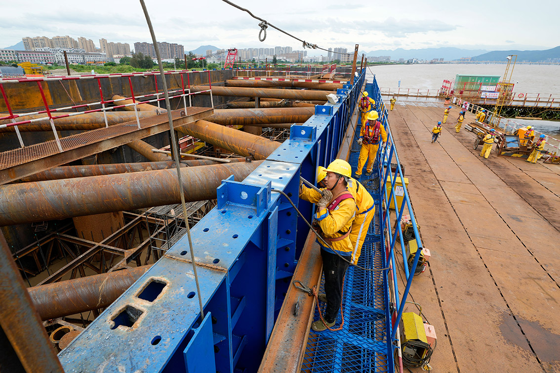 9月13日,随着今年12号台风“梅花”逼近,在浙江省瑞安市省重点工程中交路建永宁大桥项目施工现场,施工人员正在忙着加固、转移设施设备抵御台风“梅花”。(图片来源:本文图片除标注外均自中新社)