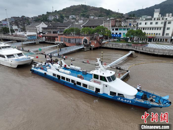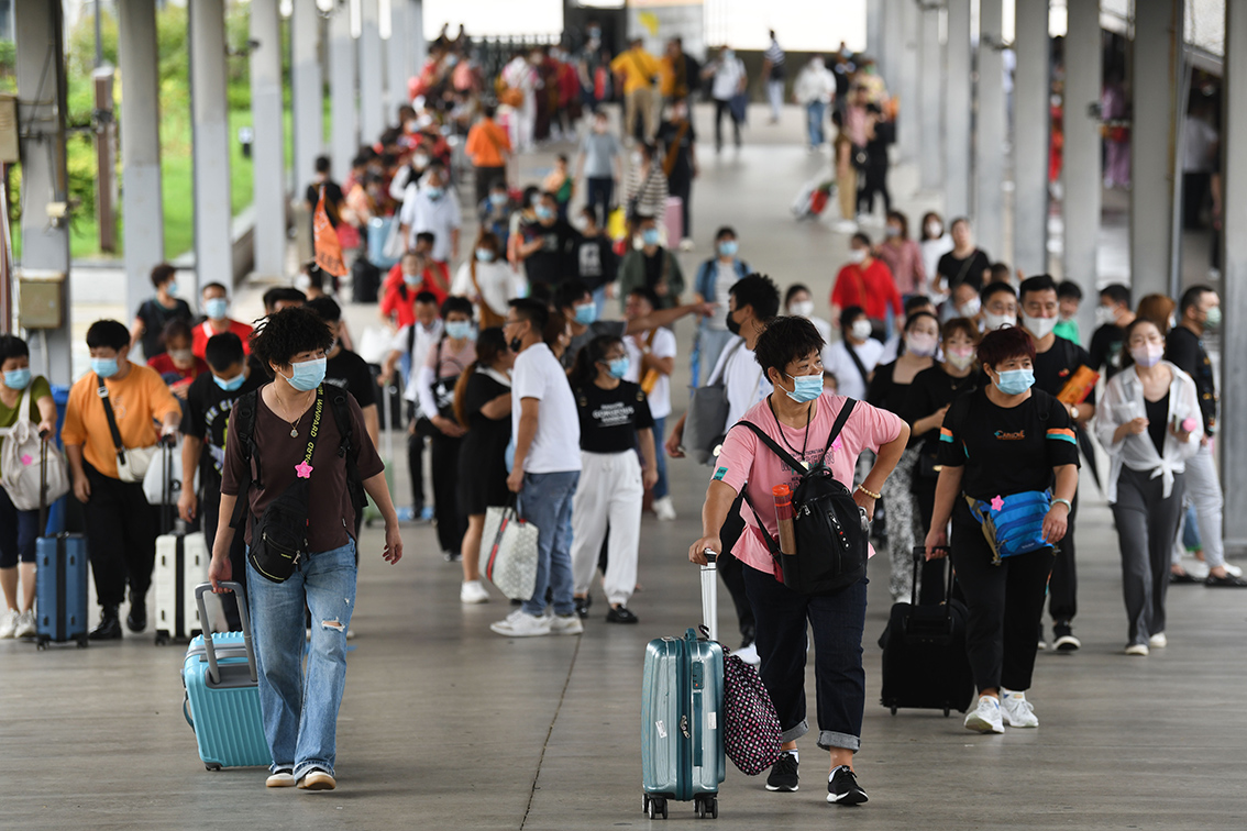 9月13日,浙江舟山蜈蚣峙码头,游客有序从普陀山景区撤离。