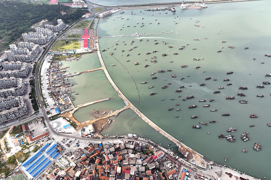 2022年9月13日,众多渔船停泊在江苏省连云港市连岛中心渔港码头港湾躲避台风。