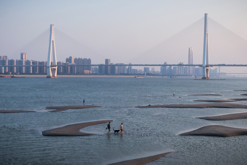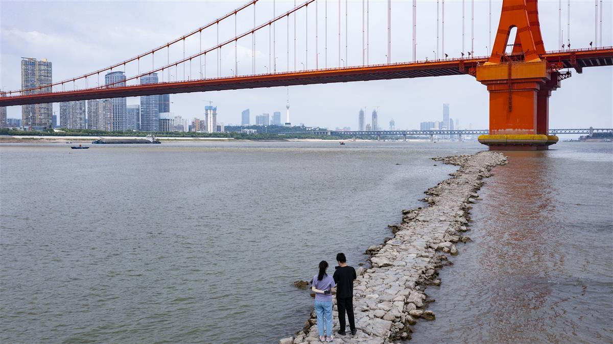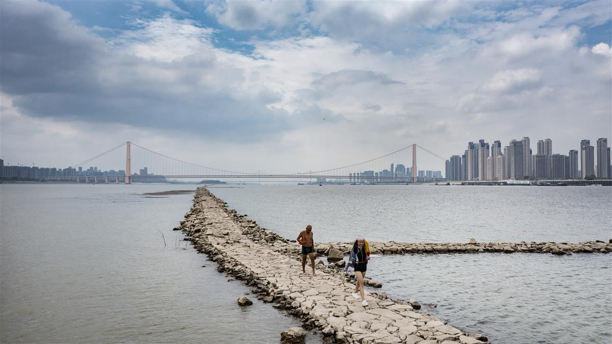 9月1日,在武汉鹦鹉洲长江大桥下,受近日长江武汉段水位持续下探影响,一段江心小路露出水面,不少游泳爱好者游到这里上岸打卡拍照。(图片来源:《湖北日报》)