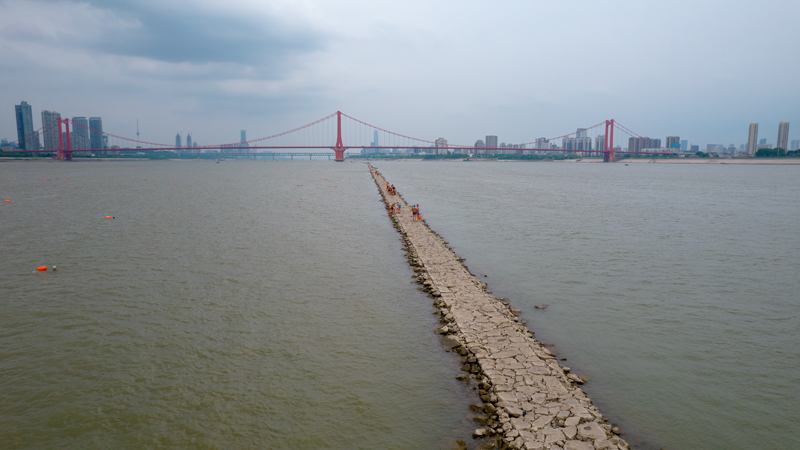 因近期长江武汉段水位退落的原因,航道整治的建筑物——丁字坝部分显露在江面上。(图片来源:中新社)