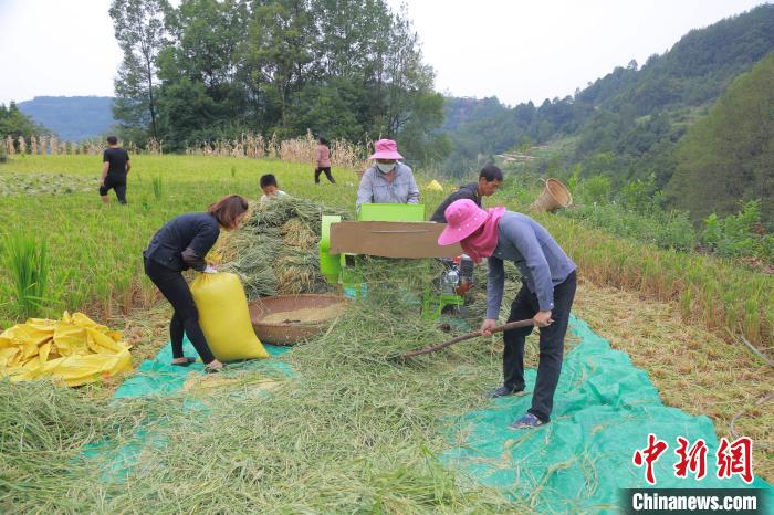村民将黄澄澄的稻谷“收入囊中”。