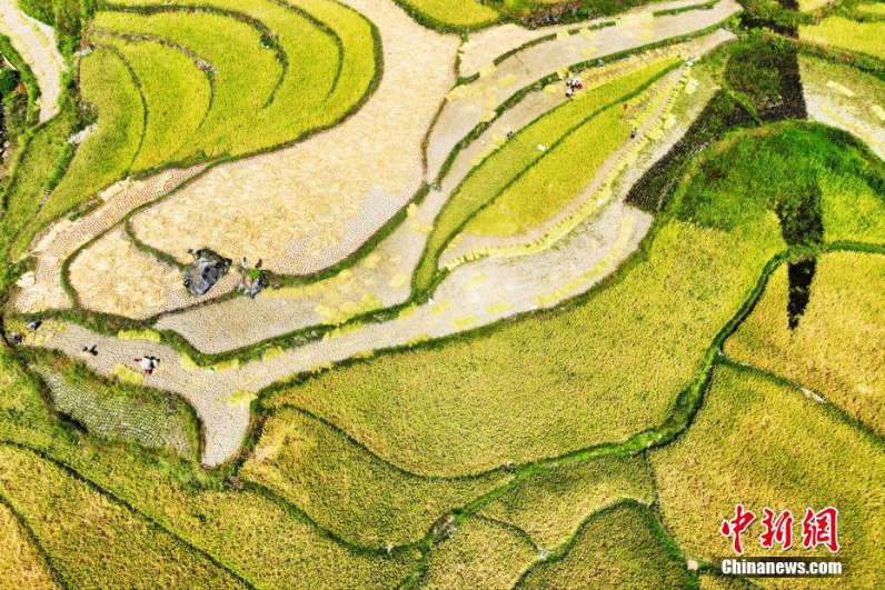 重庆市酉阳土家族苗族自治县花田乡何家岩村的万亩梯田稻谷迎来丰收旺季,层层叠叠的梯田犹如一张金地毯,美不胜收。图为色彩斑斓的梯田翻起金色稻浪,宛如天然调色板。