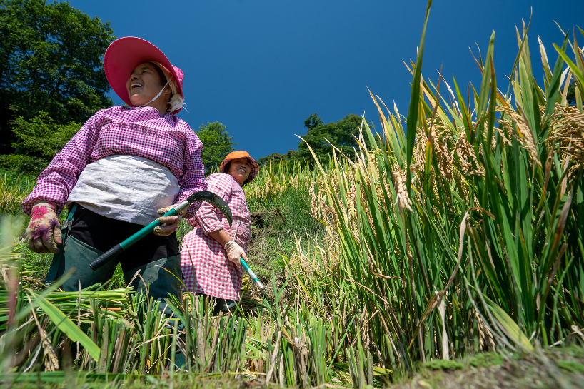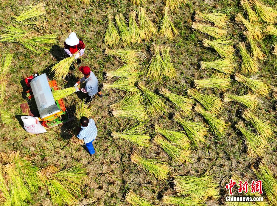 农民正抓紧时间抢抓农时,加快水稻、大豆、玉米等秋粮抢收进度,确保应收尽收、颗粒归仓、丰收在仓。图为水稻秋收。