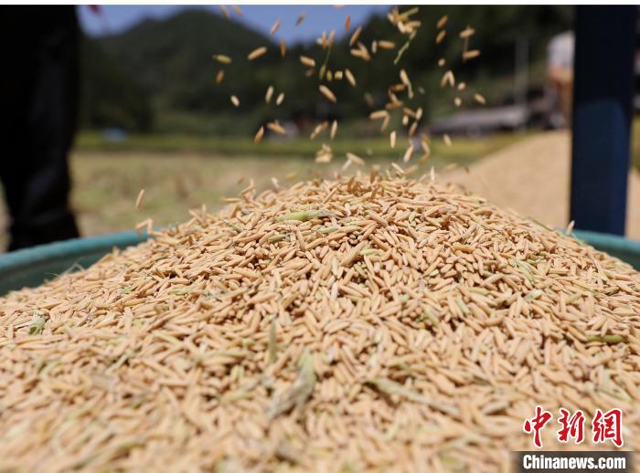 贵州剑河县南明镇收割机收割的稻谷。