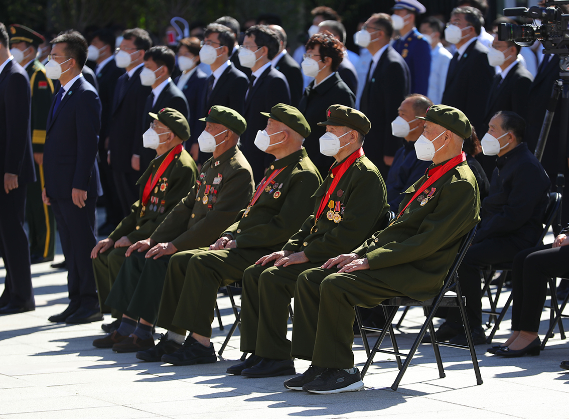 9月18日,参加过抗日战争的老战士代表在勿忘九一八撞钟鸣警仪式现场。当日上午,勿忘九一八撞钟鸣警仪式在沈阳“九一八”历史博物馆残历碑广场举行。