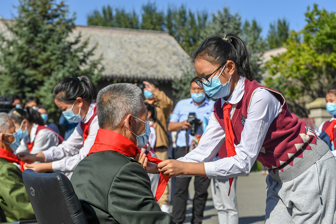 9月18日,吉林省长春市各界人士在伪满皇宫博物院同德殿广场参加九一八事变90周年纪念仪式,铭记历史,缅怀先烈。少先队员在纪念仪式上为老兵系上红领巾。