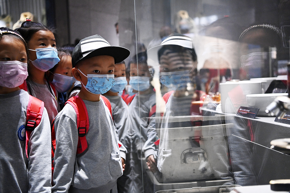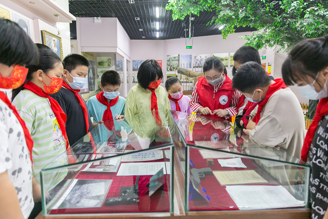 2022年9月17日,学生在江苏省如皋市中国工农红军第十四军纪念馆参观前辈们的历史遗物。(图片来源:中新社)