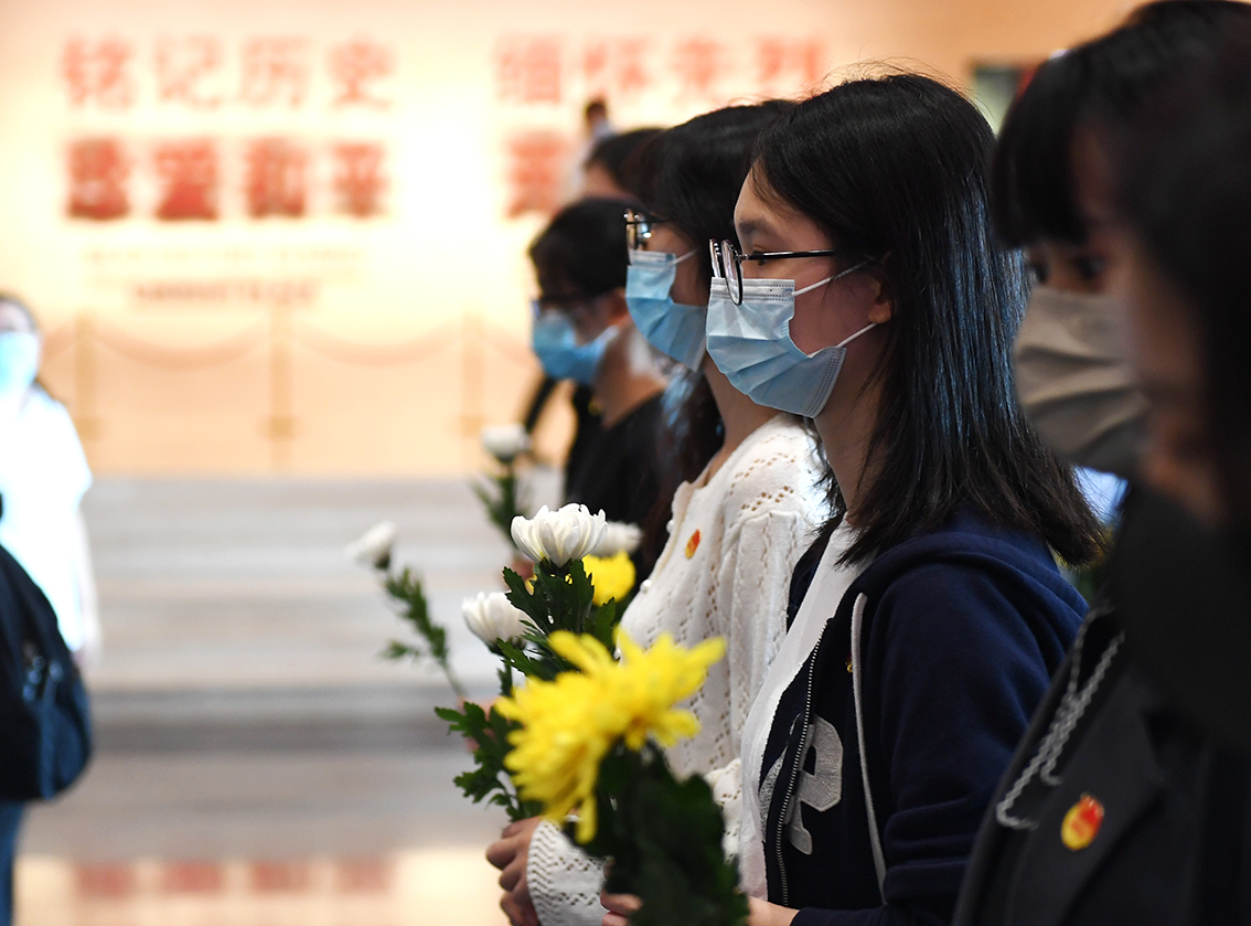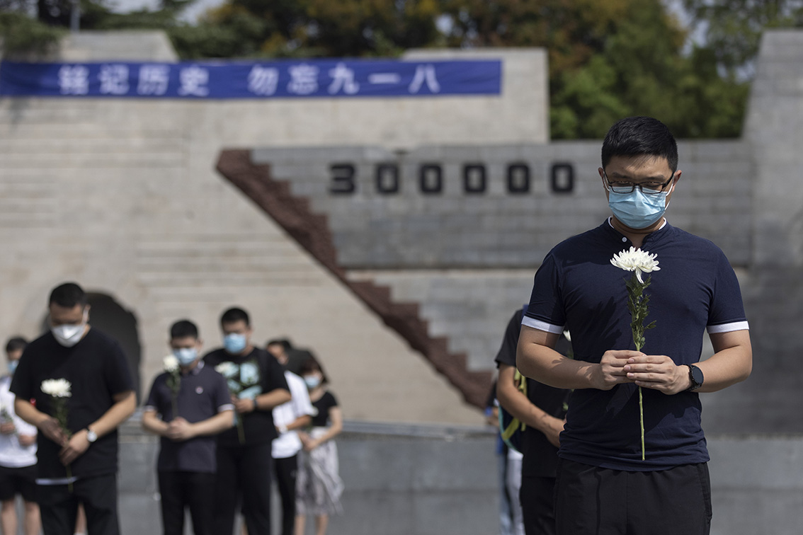 9月18日,侵华日军南京大屠杀遇难同胞纪念馆举行“铭记历史勿忘九一八”主题教育活动,随着防空警报声的响起,民众手持鲜花默哀,缅怀遇难同胞。(图片来源:中新社)