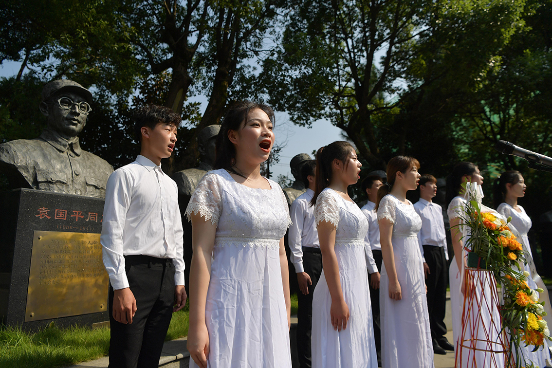 9月18日,在江西省南昌市新四军军部旧址陈列馆纪念广场,参加纪念九一八事变爆发90周年活动的各界人士合唱《松花江上》。