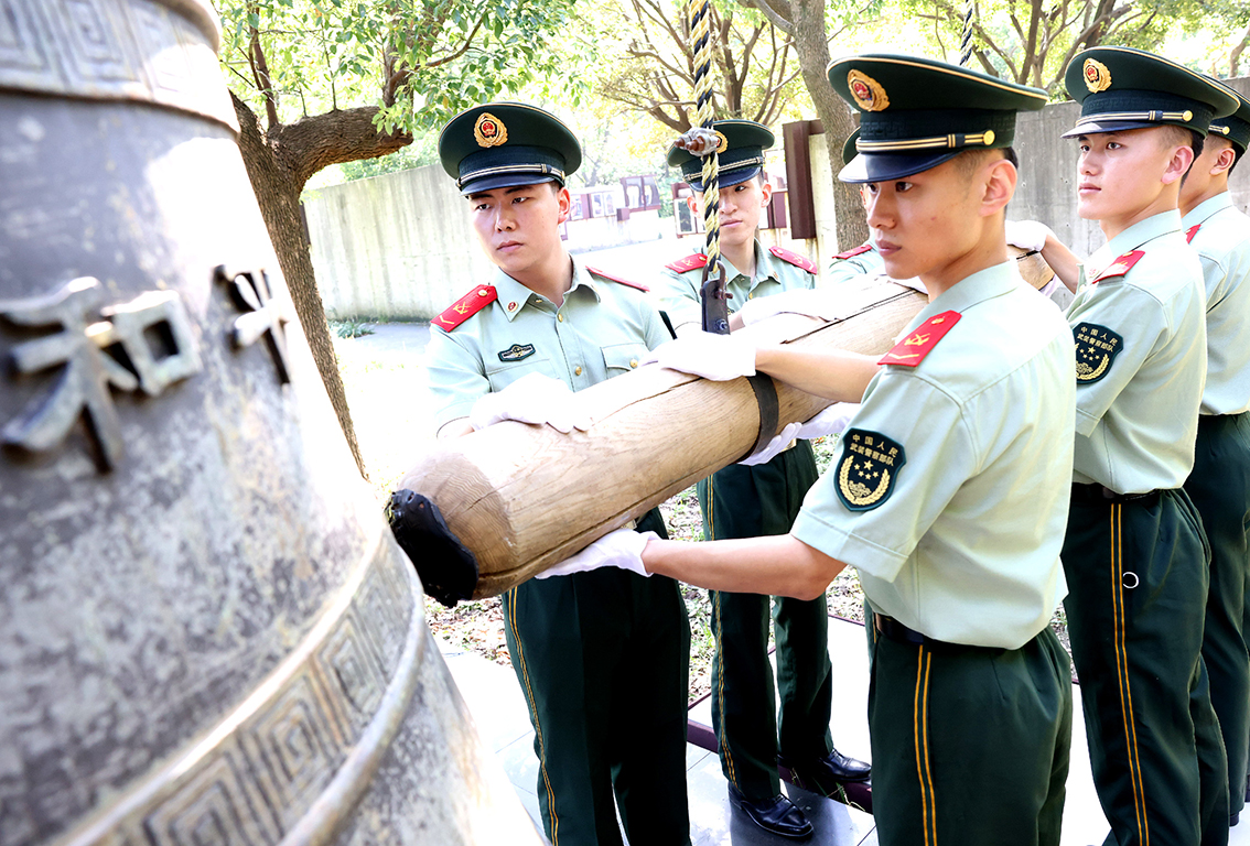 9月18日,武警战士在“铭记九一八事变爆发90周年”活动中撞响“警世钟”。 当日,上海淞沪抗战纪念馆举行“铭记九一八事变爆发90周年”活动。