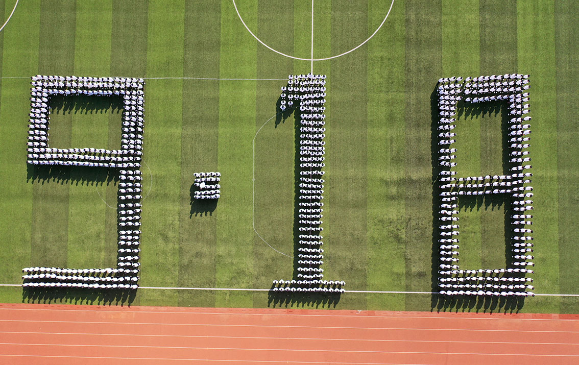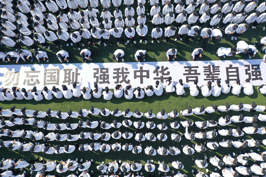2022年9月18日,安徽省亳州职业技术学院组织学生在操场上拼出“9·18”字样,进行爱国主义教育。(图片来源:中新社)