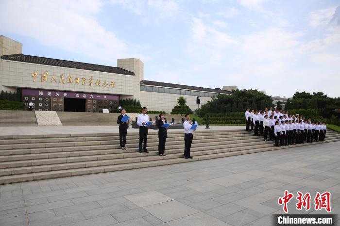 9月18日,中国人民抗日战争纪念馆举行“铭记历史勿忘九一八”主题活动。抗战馆讲解员与志愿者合唱团共同演绎了被誉为“流亡三部曲”的《松花江上》《流亡曲》和《复仇曲》。(图片来源:中新网)