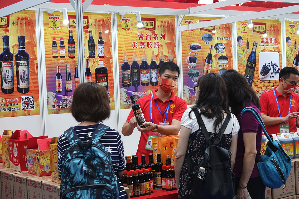 9月16日,在东博会新加坡国家展厅,观众在选购新加坡品牌酱油。