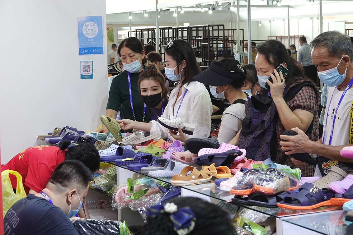 9月17日,在东博会越南国家展厅,观众在选购越南橡胶拖鞋。