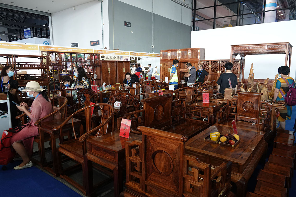 9月17日,在东博会越南国家展厅,观众在选购越南黄花梨家具。
