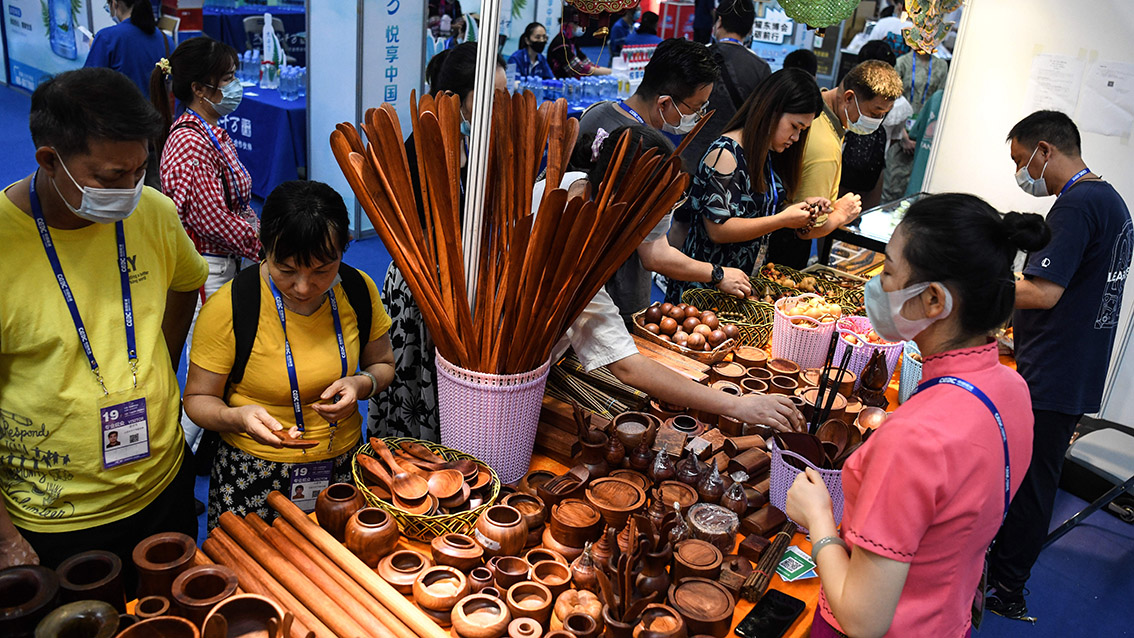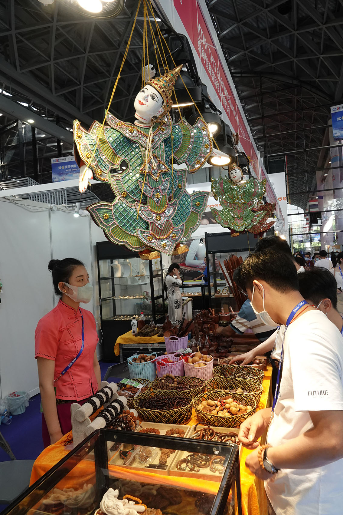 9月17日,在东博会缅甸国家展厅,观众在选购缅甸特色工艺品。