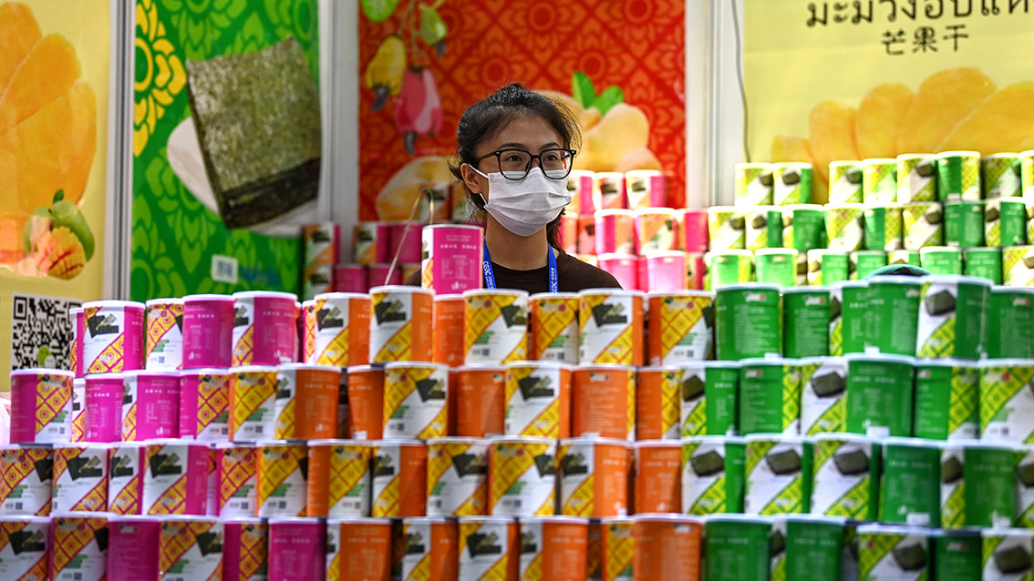 9月18日,在南宁国际会展中心,展商在推介泰国芒果干。 (图片来源:新华社)