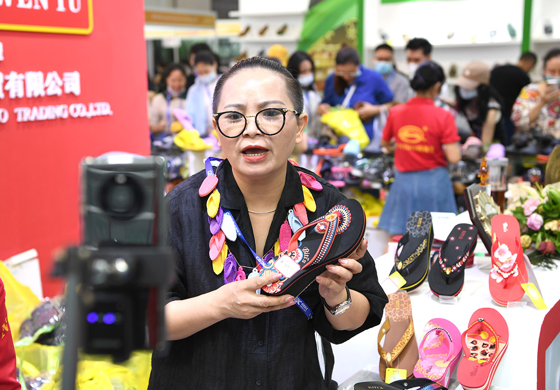 9月18日,在南宁国际会展中心,一名主播在介绍越南拖鞋。 (图片来源:新华社)