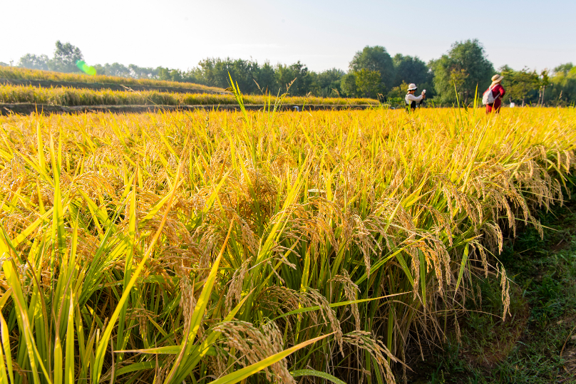 9月22日,北京市中坞公园的京西稻颗粒饱满、静待收获,吸引市民在田埂间观赏、拍照。(图片来源:中新社)