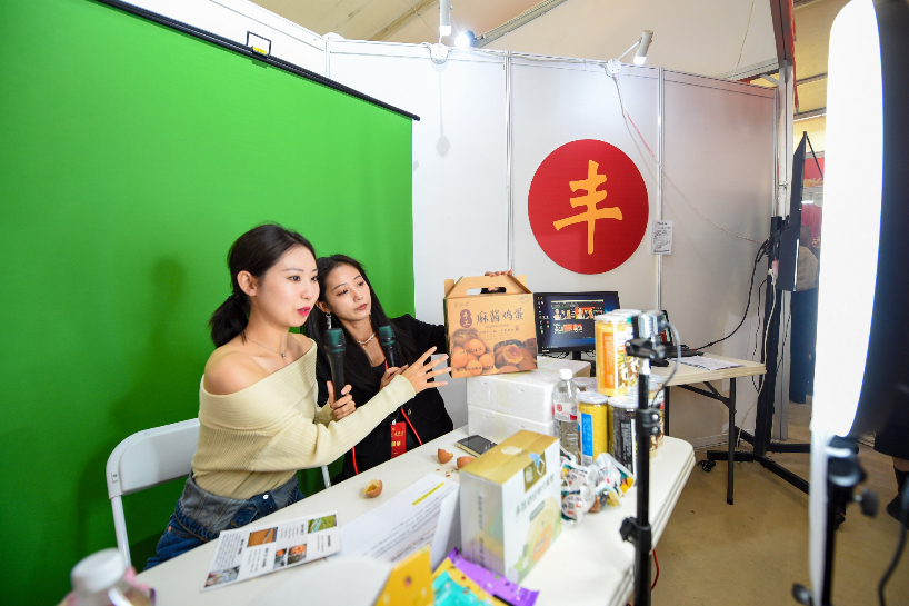 此次活动包括庆丰收趣味运动会、五谷丰登展览、网红主播联动直播、乡村特色文艺表演等多项内容。图为主播在2022年内蒙古“中国农民丰收节”主会场庆祝活动上直播带货。(图片来源:新华社)