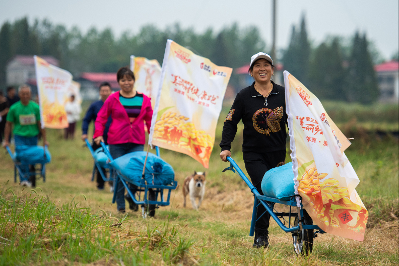 21日,湖南省益阳市南县麻河口镇举行“农民稻田趣味运动会”,当地村民和游客通过环田跑步、收获水稻、稻田捉鸭、斗车运粮等运动比拼,迎接中国农民丰收节的到来。图为当地村民和游客在比拼斗车运粮。(图片来源:新华社)