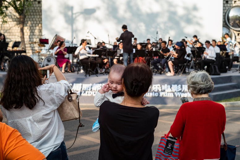 25日傍晚,在北京市朝阳区街头举办的第三届丽都国际露天音乐电影周期间,一场音乐会的演练阶段即吸引市民驻足欣赏。(图片来源:本文图片除标注外均综编自中新社)