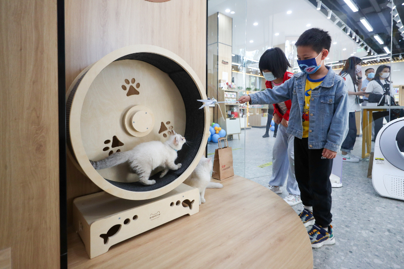 25日,北京市新华书店首家宠物主题书店开业亮相,小朋友与书店内的猫玩耍。该书店将书香文化与宠物主题结合,为读者提供全新的沉浸式阅读体验。