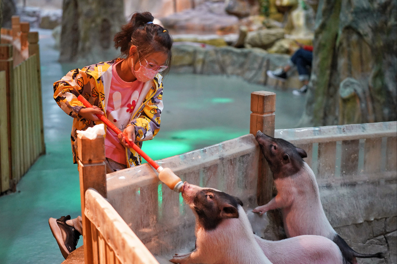 25日,在黑龙江哈尔滨中央大街的一处室内动物园,一名儿童投喂小猪。