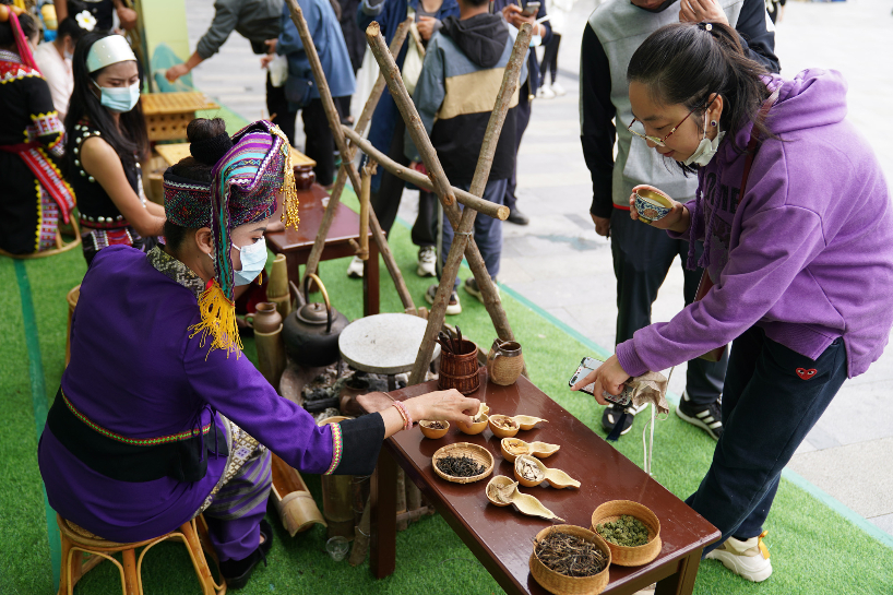 25日,云南双江拉祜族佤族布朗族傣族自治县推介活动正在昆明举行,现场特色民族茶艺展示吸引市民驻足观赏、品茶。该县位于云南省临沧市,县内有着原始植被保存最完整的世界第一野生古茶树群落,拥有享誉海内外的百年栽培型冰岛古茶。图为市民向工作人员咨询拉祜族丁香茶的配料。