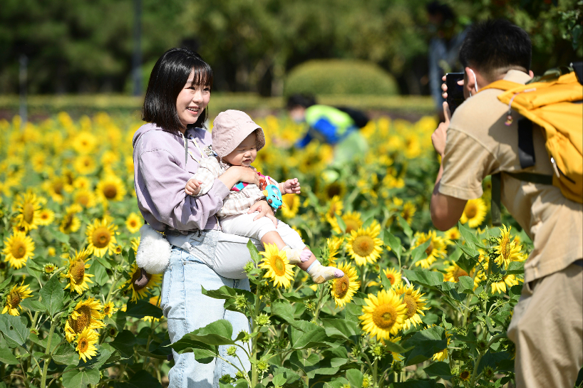 25日,市民在北京地铁文化公园向日葵田里拍照留影。