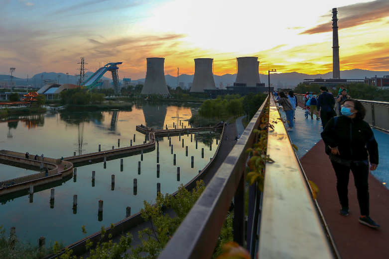 24日,市民在北京首钢园空中步道游览,乐享周末时光。