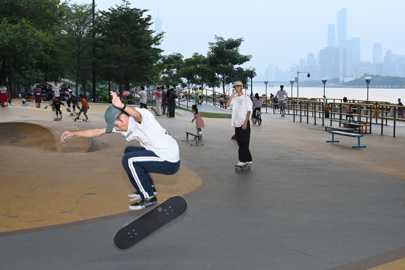 24日,广东广州,滑板爱好者在琶洲大桥南侧桥底的滑板公园享受运动乐趣。