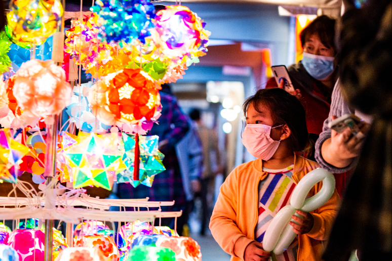 第三届北京丽都国际露天音乐电影周活动拉开序幕,期间市民可在街头欣赏交响乐演奏、小型音乐会,观看露天电影,并在夜间市集购物消费。图为一名小朋友经过北京市朝阳区丽都花园附近的夜间市集彩灯摊位。