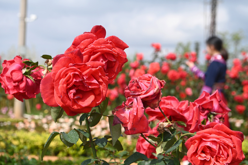 近日,云南省昆明市大观公园内种植的月季花盛开,花团锦簇吸引市民前来赏花拍照。