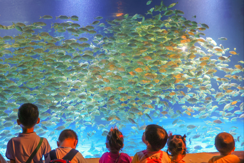 江苏南京,海底世界一万多尾黄鹂无齿鲹(别名黄金鲹)在海洋池内时而上浮时而翻转,或聚或散绽放出金色光束,伴随着音乐“起舞”。图为小朋友被游弋的黄鹂无齿鲹吸引。