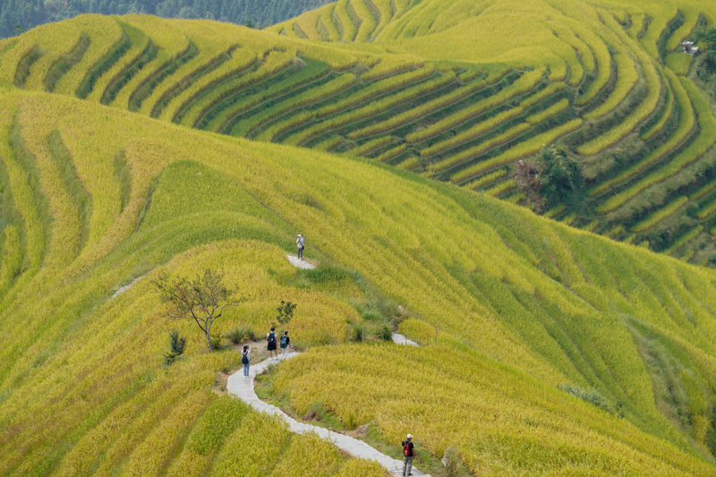 9月23日,广西桂林市龙胜各族自治县龙脊梯田呈现出“金渐层”景观。(图片来源:中新社)