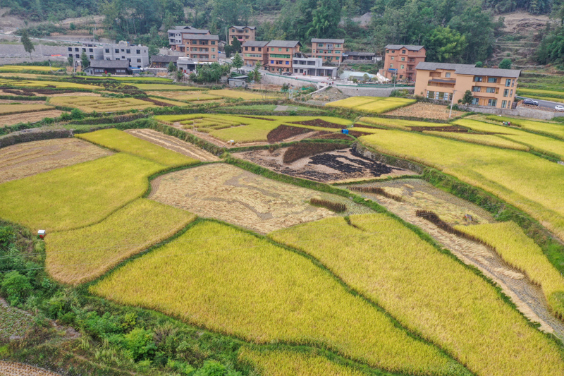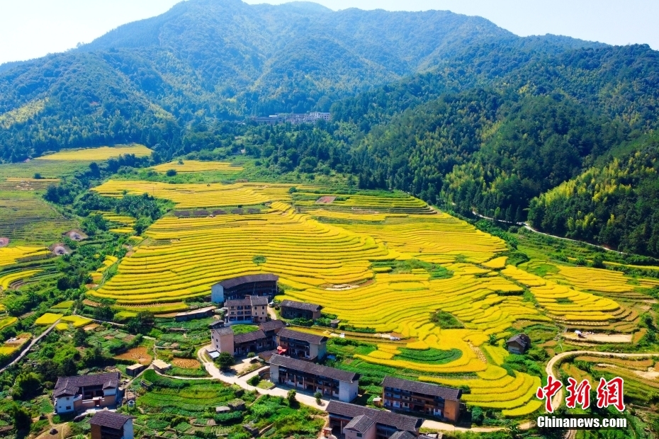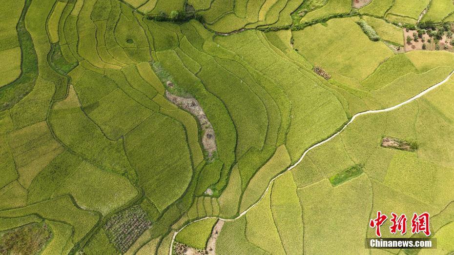 金秋九月俯瞰梯田 呈“金渐层”景观