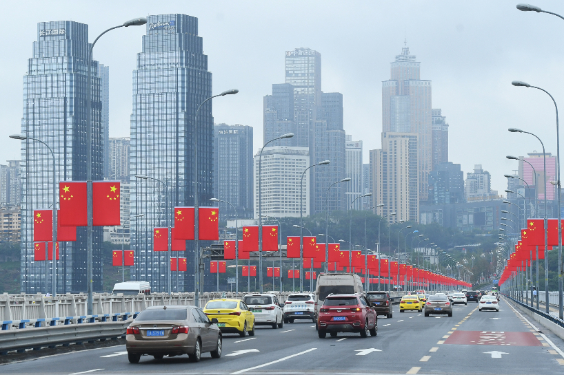 9月27日,重庆长江大桥上悬挂五星红旗,国庆氛围渐浓。(图片来源:中新社)