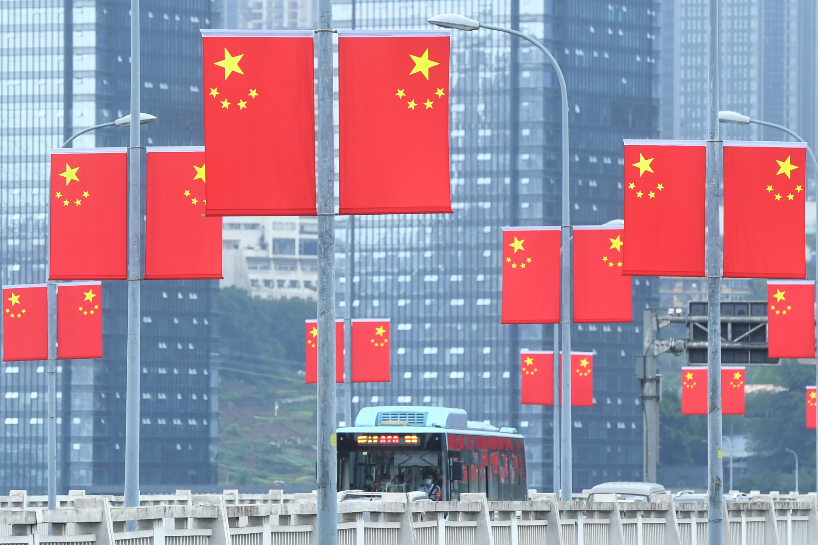 重庆长江大桥上悬挂五星红旗,国庆氛围渐浓。(图片来源:中新社)