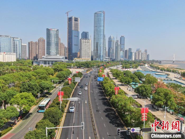 航拍南昌红谷滩区赣江中大道两旁的路灯上悬挂的国旗在绿树映衬下格外醒目。(图片来源:中新网)