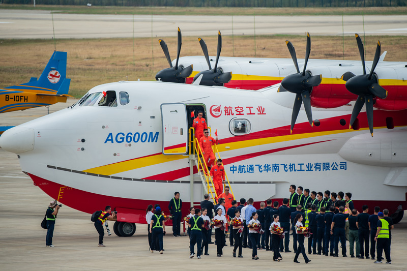 9月27日,“鲲龙”AG600M机组人员在完成试验后走下飞机。(图片来源:新华社)