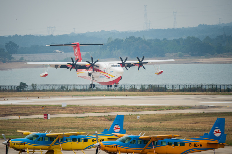 9月27日,“鲲龙”AG600M在漳河机场降落。(图片来源:新华社)