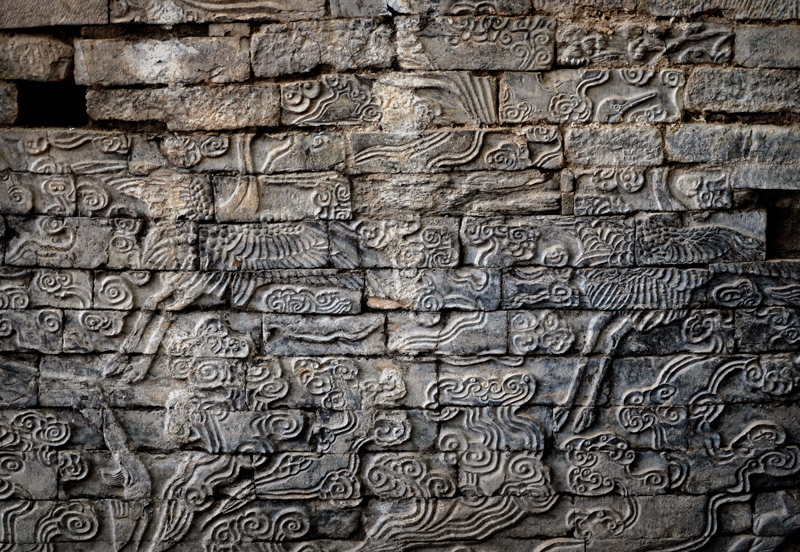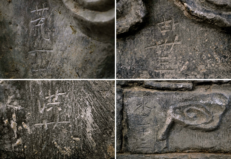 巨幅石雕祥瑞壁画上的编码,在宋代砌筑时起到防止壁画错乱的作用(拼版照片,9月21日摄)。
