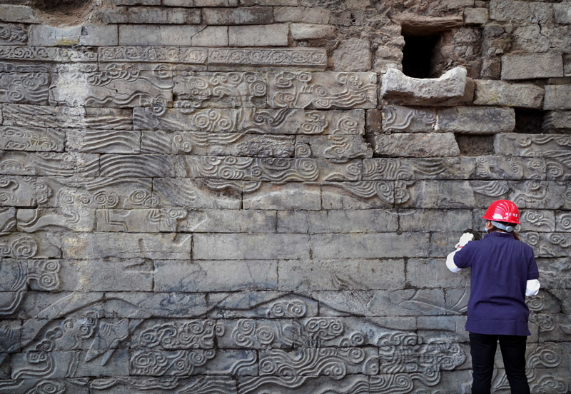 “考古中国”重大项目开封北宋东京城州桥遗址出土巨幅石雕祥瑞壁画,为目前我国发现的北宋时期最大的石刻。据介绍,巨幅石雕祥瑞壁画对称分布在州桥东侧南北两岸,壁画通高约3.3米,目前已揭露南岸壁画长约23.2米,北岸壁画长约21.2米,雕镌有海马瑞兽、飞鹤、祥云等图案。目前,该石雕壁画还在清理发掘中,推测单幅壁画总长约30米,桥东西两侧四岸壁画构成百米长卷,总雕刻面积将达400平方米。(图片来源:本文图片除标注外综编自新华社)