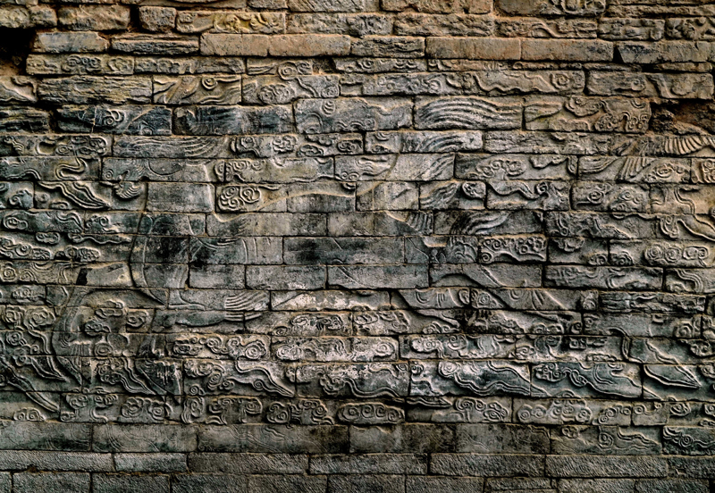 这是巨幅石雕祥瑞壁画上的海马瑞兽。