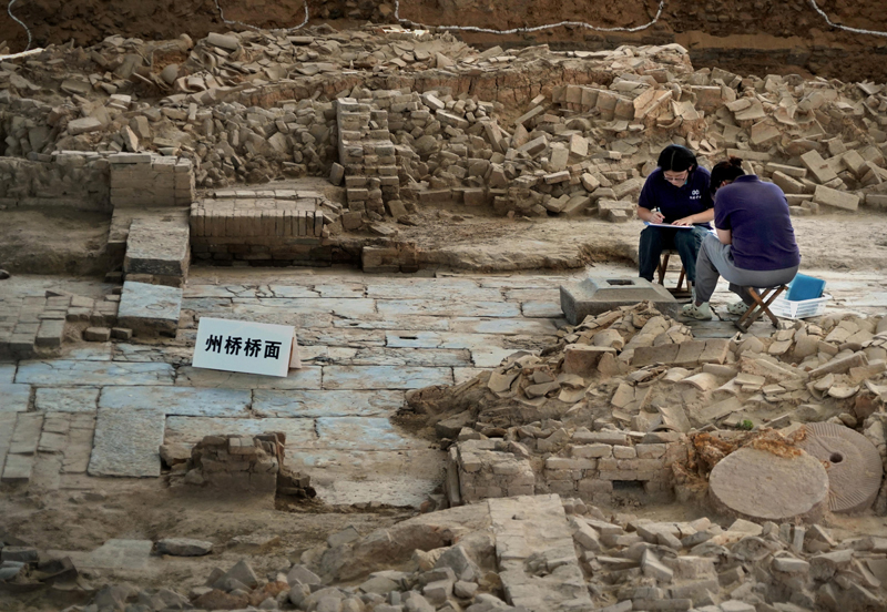 工作人员在开封北宋东京城州桥遗址现场绘图。