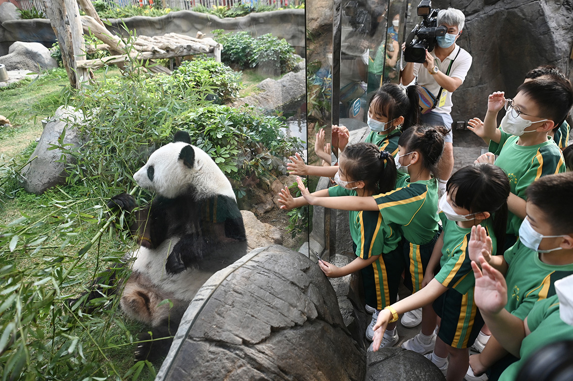 图为学生近距离接触大熊猫盈盈。 (图片来源:中新社)