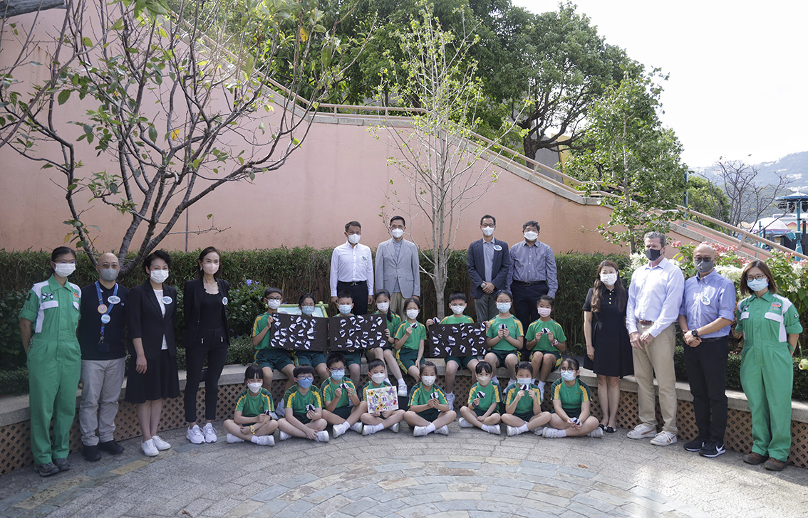 图为香港文化体育及旅游局局长杨润雄(后排左二)、香港海洋公园公司主席庞建贻(后排右二)等人合影。(图片来源:中通社)